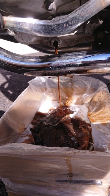 画像じゃわかんないだろうけど結構勢いよく飛び出るから気を付けよう。乗った後すぐに交換するとやけどするかも。でも乗ってすぐだとオイルがやわらかくなって替えやすいんだよなぁ…
